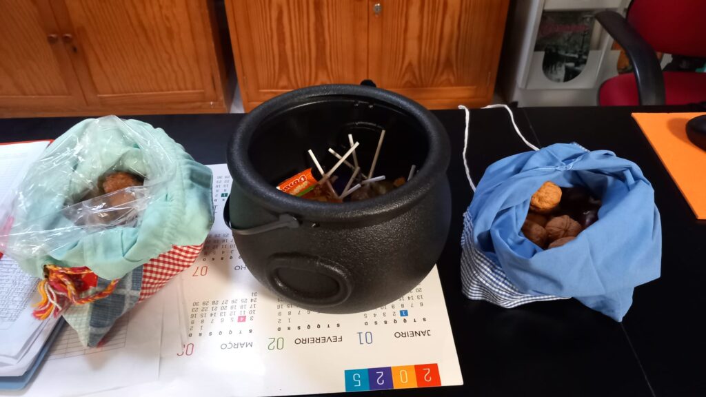 Mas não esquecemos as castanhas, as nozes, as merendeiras confeccionadas pelos alunos do Curso Profissional de Cozinha, e os doces que tradicionalmente são oferecidos às crianças que, de porta em porta, andam ao “bolinho” / “pão por Deus”.